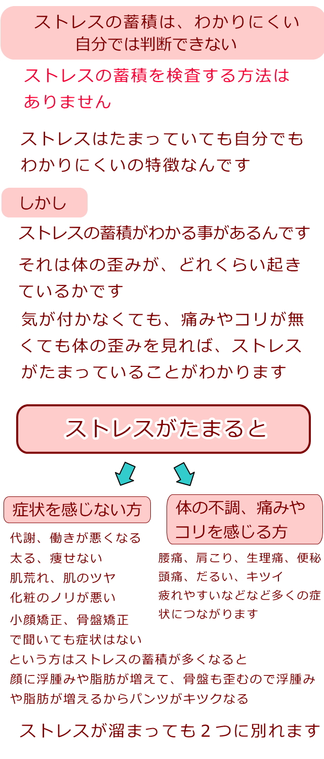 それは普段の生活で蓄積してしまうものが深く関係していますが、多くの方は理解できていません。しかし人は何をするにも生み出してしまい、これが体にたまって増えたことをストレスと言い、増えるものが原因で体の崩れ、体の歪みを起こしていき、痛みやコリになります。